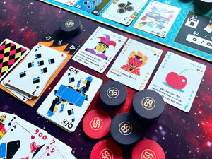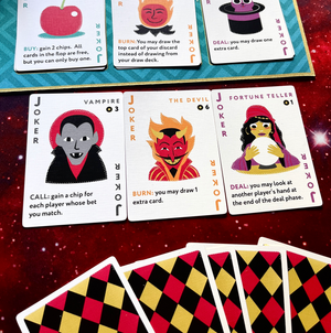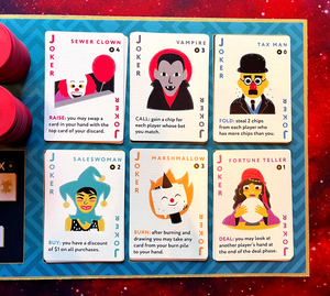 Throughout the game, players may buy jokers from six different joker decks, each linked to a part of the game sequence. Raise jokers trigger when you raise a bet, Fold jokers when you fold a bet, and so on.